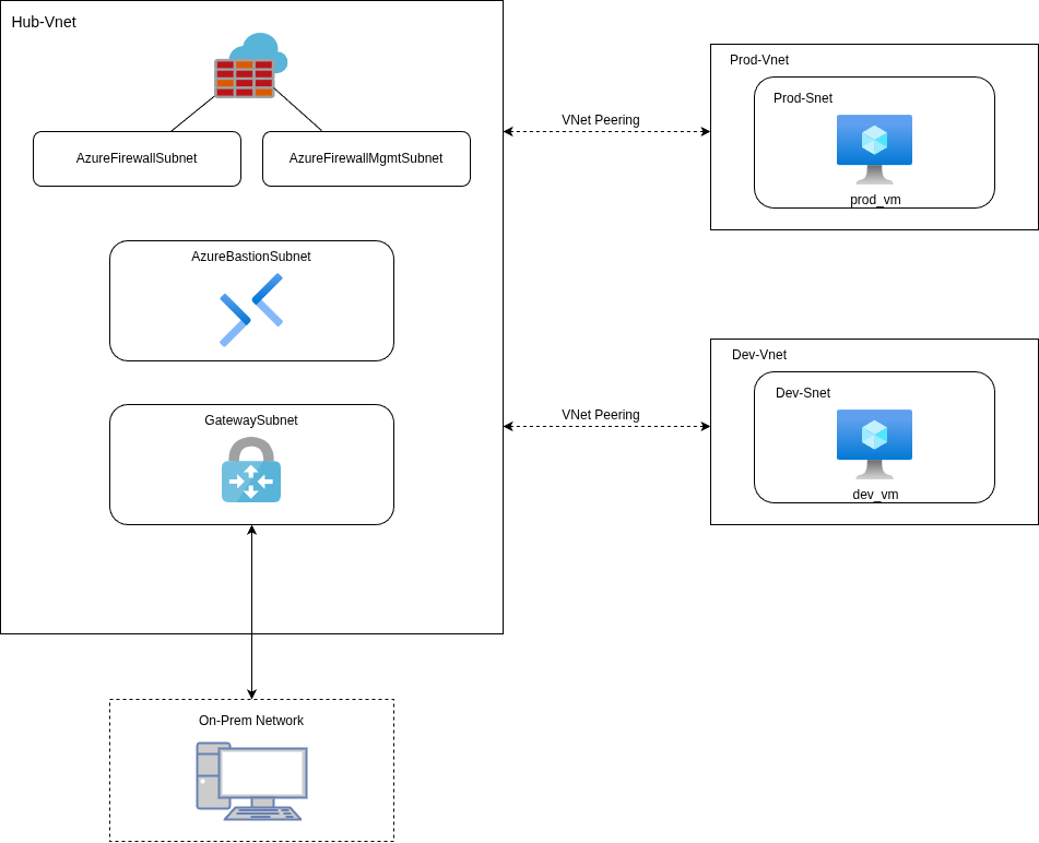 The “Prod” and “Dev” spokes both have Ubuntu Server VMs for testing, and NSGs that allow SSH traffic from the Bastion subnet.